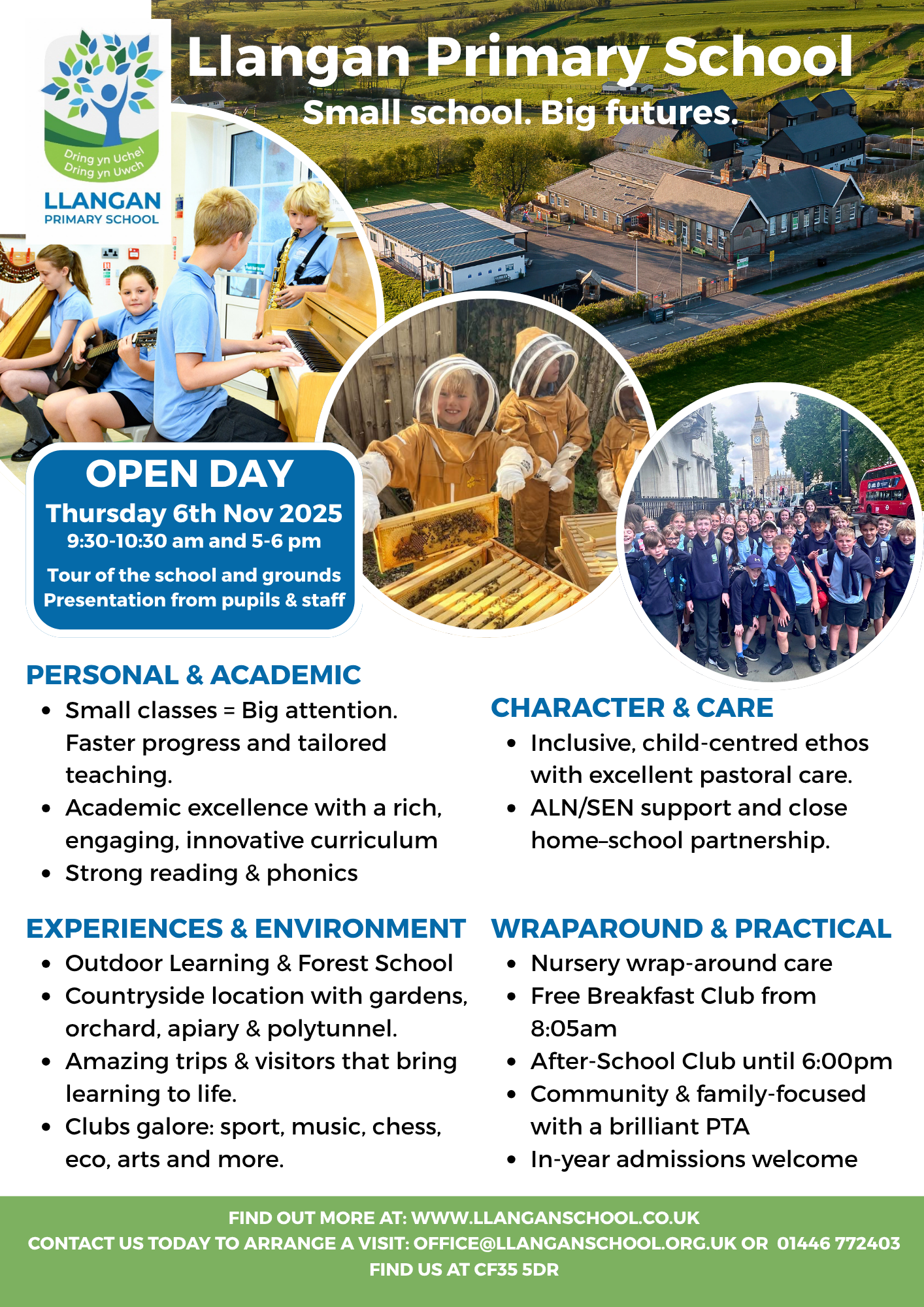 Thank you, as always, for your continued support and encouragement. Llangan is a special place because of the people — pupils, staff, parents, and community — who make it thrive. I hope everyone enjoys a well-earned rest over half term.