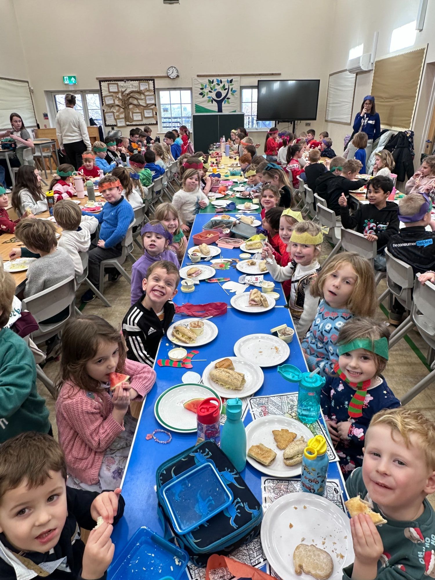 We ended the term with a whole-school Christmas Party Buffet in the hall. The children enjoyed crackers and party gifts provided by the PTA, adding a festive touch to the afternoon. Cez, our school cook, and Colette, our kitchen assistant, prepared a delicious spread including baguettes, sausage rolls, salad, fruit and Christmas shortcakes. The children sang Christmas songs, shared jokes from their crackers and enjoyed spending time together. Year 6 did a fantastic job decorating the hall and helping prepare the space for everyone.