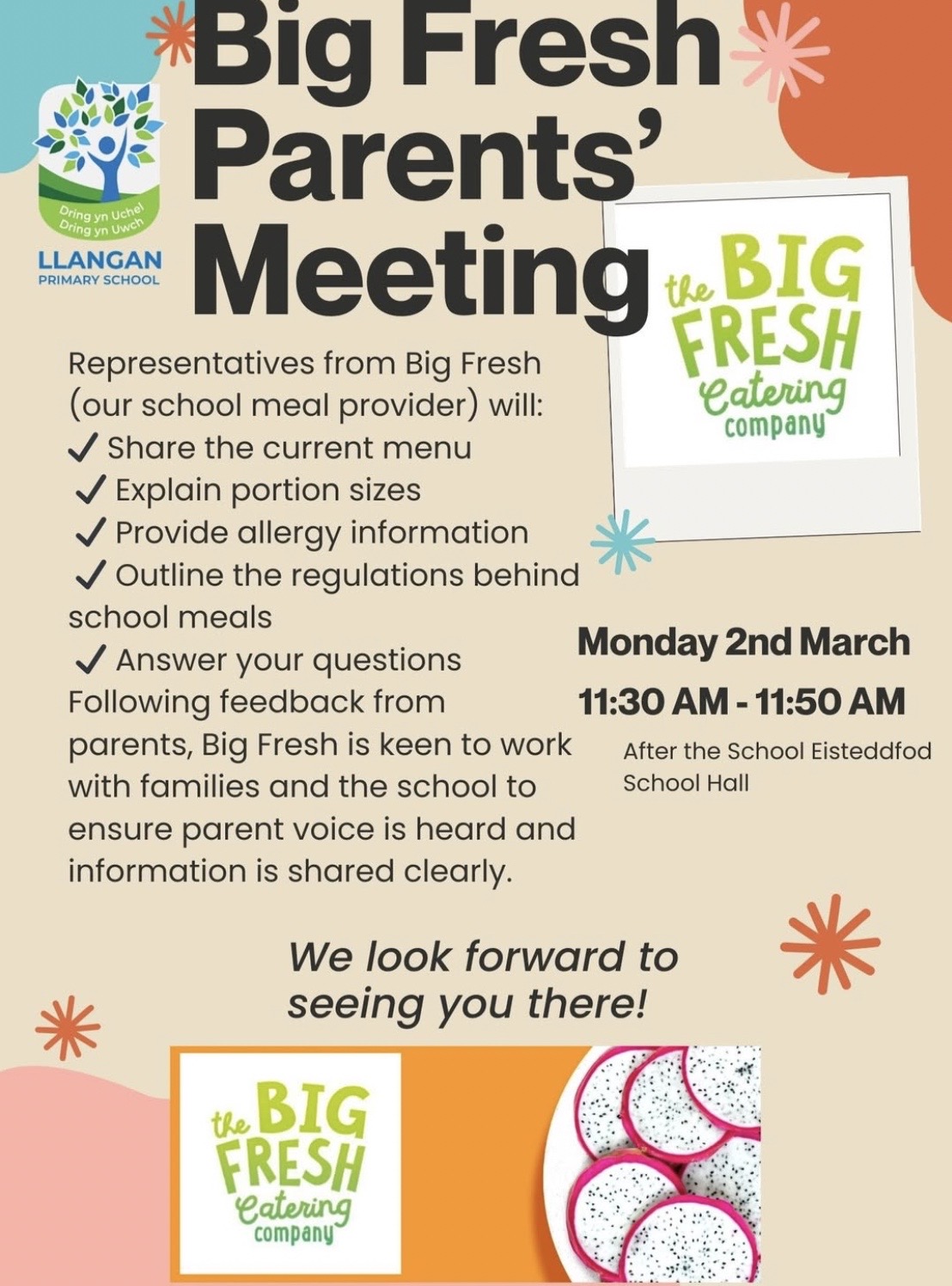 Following feedback and questions raised about school meals, we are pleased to invite parents to attend a Big Fresh Parents’ Meeting in the school hall immediately after the Eisteddfod.