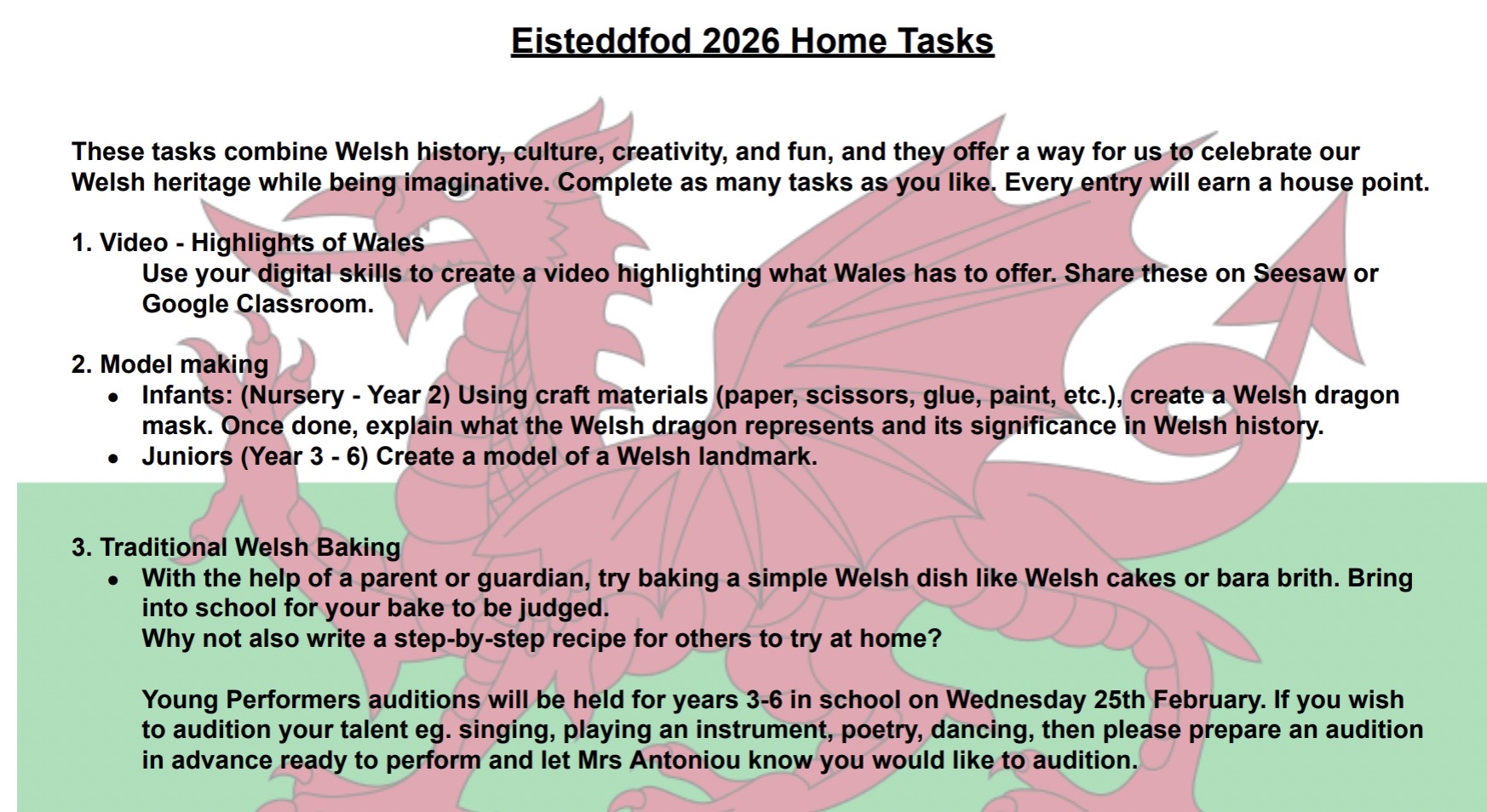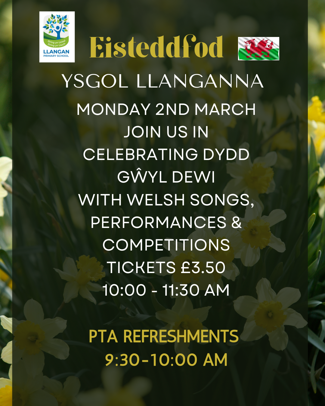 We are delighted to invite parents and carers to join us for our St David’s Day Eisteddfod — a joyful celebration of Welsh culture, music and talent.