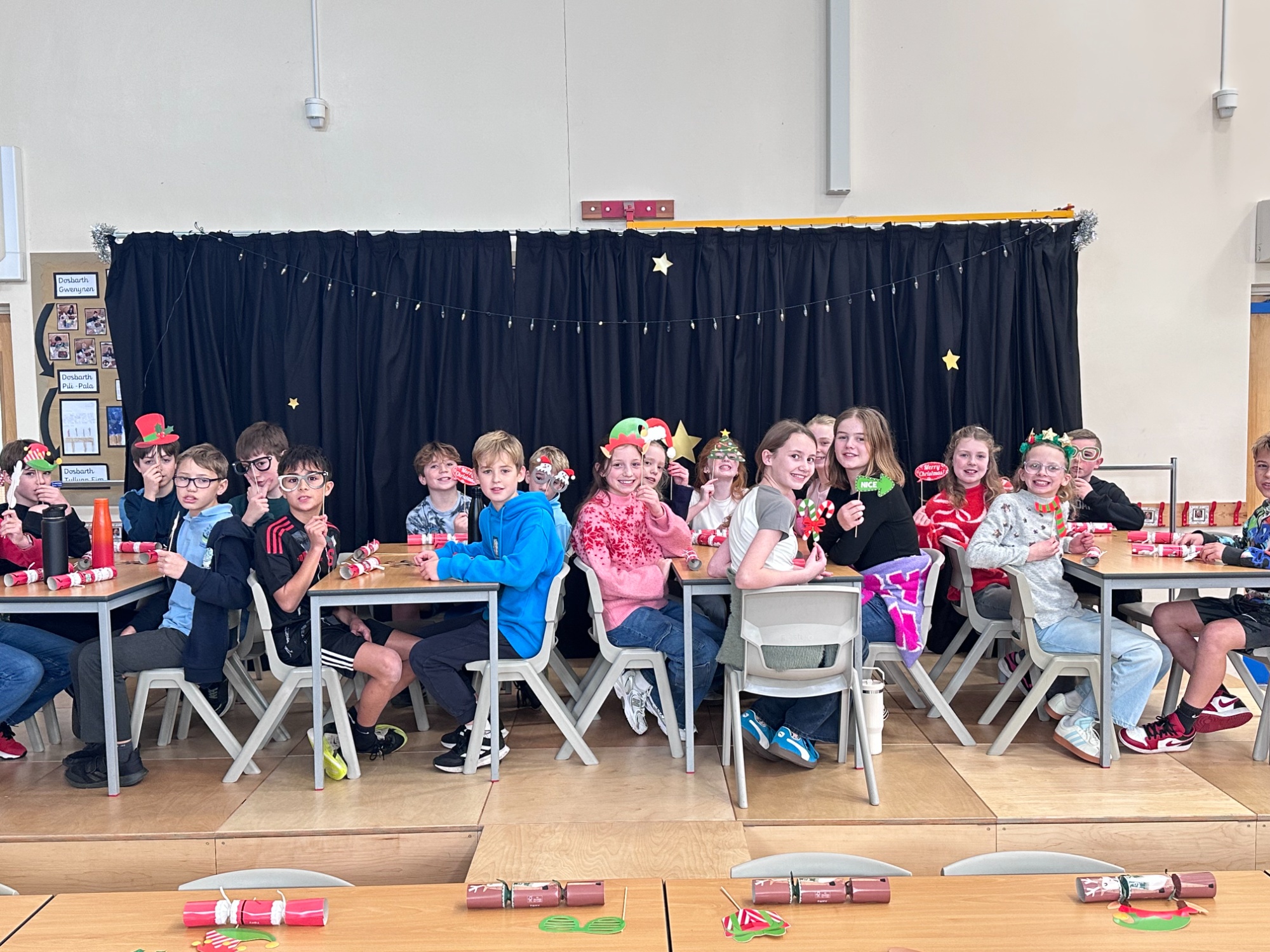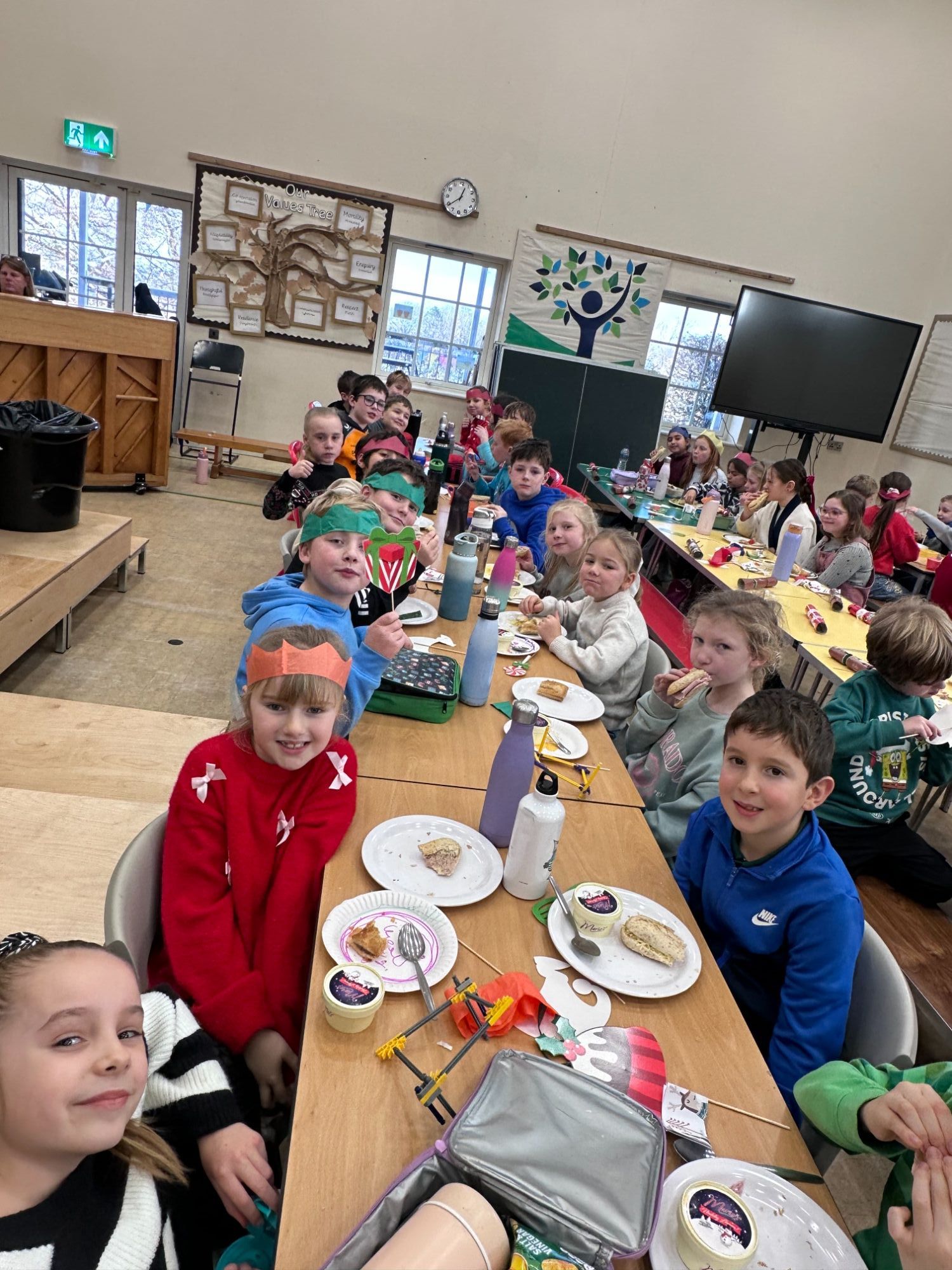 We ended the term with a whole-school Christmas Party Buffet in the hall. The children enjoyed crackers and party gifts provided by the PTA, adding a festive touch to the afternoon. Cez, our school cook, and Colette, our kitchen assistant, prepared a delicious spread including baguettes, sausage rolls, salad, fruit and Christmas shortcakes. The children sang Christmas songs, shared jokes from their crackers and enjoyed spending time together. Year 6 did a fantastic job decorating the hall and helping prepare the space for everyone.