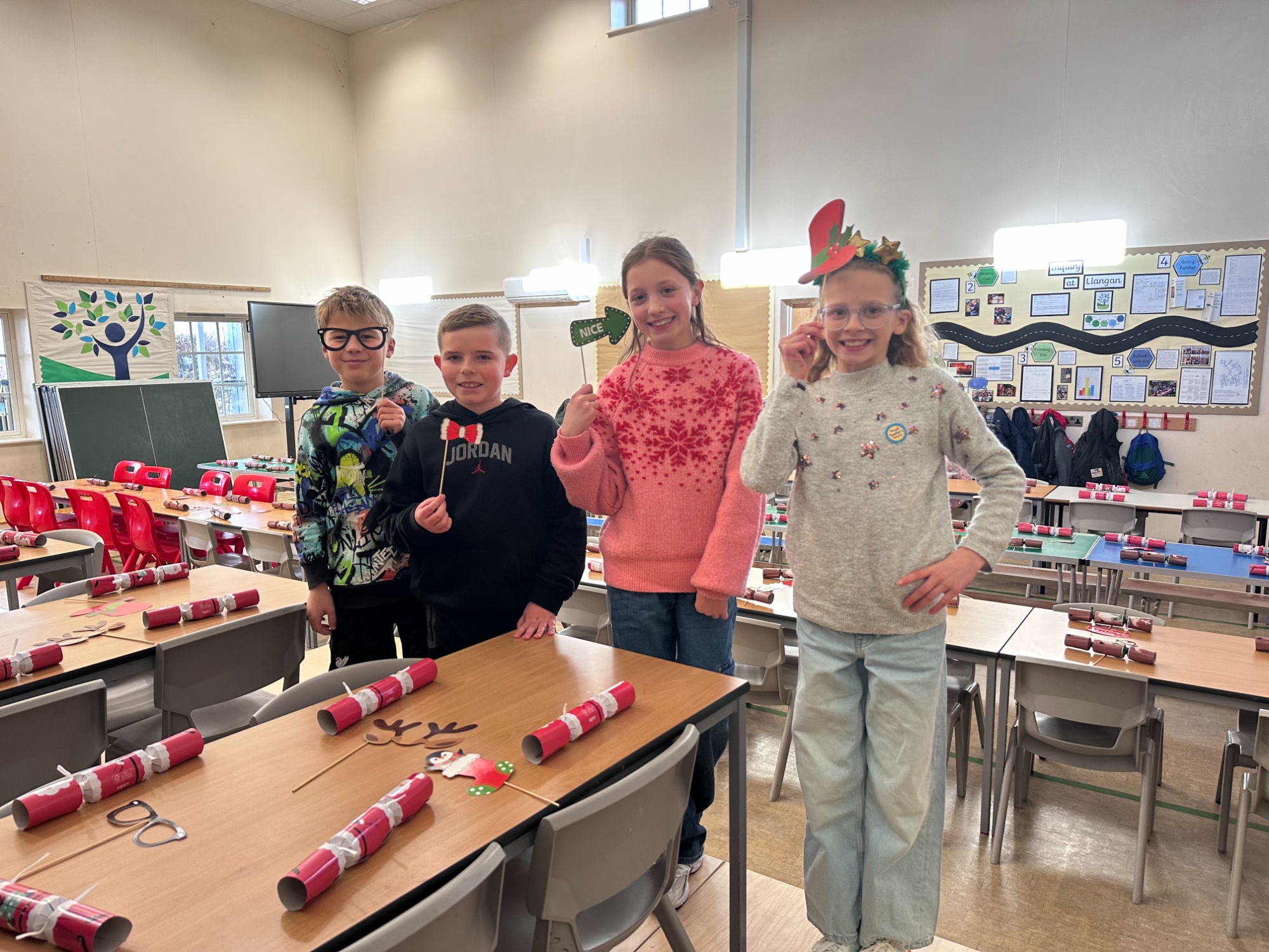 This was followed by a special assembly to say goodbye to Mrs Woodward, who leaves us at the end of term after 17 years of dedicated service. During her time at Llangan, Mrs Woodward has brought laughter, kindness and energy to our school, teaching PE to all pupils, leading netball club and supporting trips and residentials. Her fun-loving spirit and genuine care for the children will be greatly missed. She is excited to begin a new chapter but is already planning to visit us again in January. Year 6 shared a poem, we sang the school song, and she was presented with cards and gifts, with Father Christmas sitting proudly alongside her throughout the assembly.