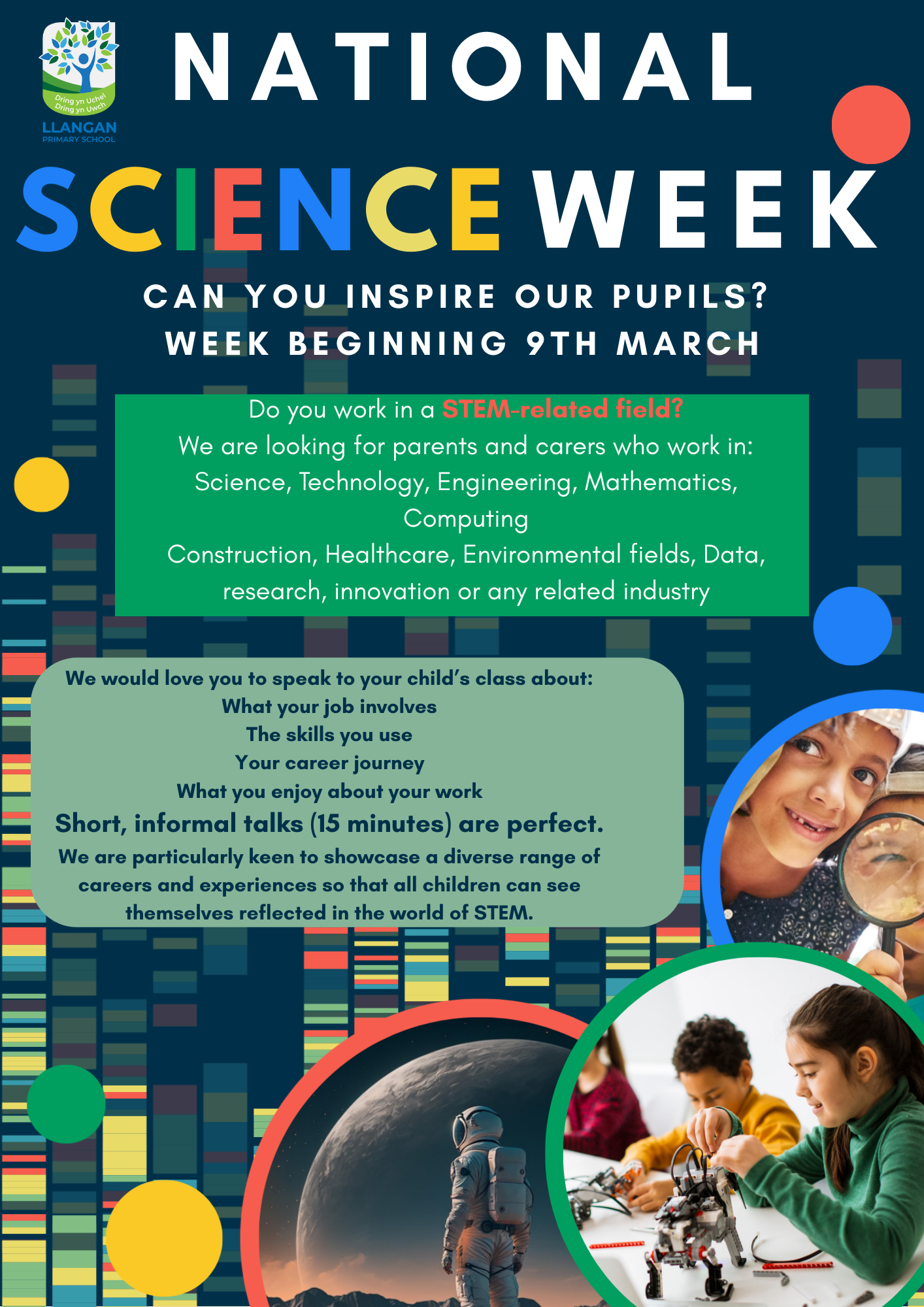 We would love to invite any parents or carers who work in a STEM-related field to speak to pupils about their work. STEM covers a wide range of careers, including engineering, computing, healthcare, construction, environmental science, research, data and innovation.