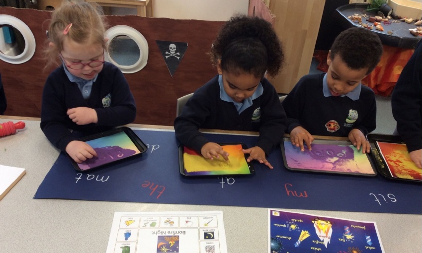 We also talked about firework safety, and in our literacy area, created colourful posters to remind others how to keep safe on Bonfire Night. In the creative area, we made mixed media firework pictures inspired by the sounds and colours of Bonfire Night. In phonics, we wrote our own ‘firework words’ inspired by the night sky, using our sounds to describe the pops, bangs, and crackles we could imagine.