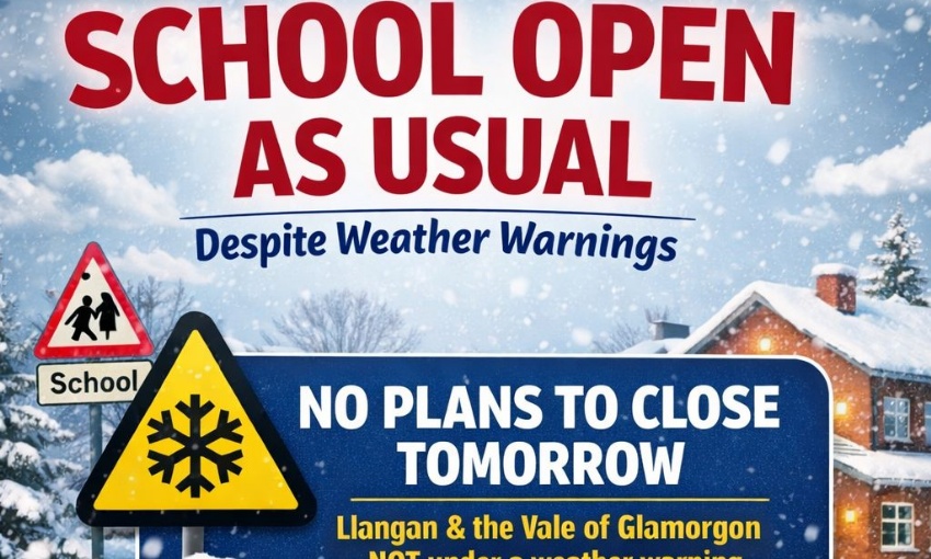 Despite weather warnings for snow overnight and tomorrow linked to Storm Goretti, we have no plans to close school tomorrow. Llangan and the Vale of Glamorgan are not currently within the Met Office weather warning area, and school is therefore expected to be open as normal.