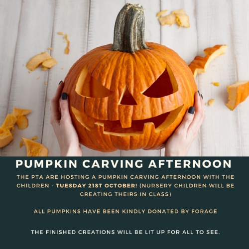 Our PTA are hosting a fun pumpkin-carving afternoon with the children on Tuesday 21 October. (Nursery will make theirs in class.)