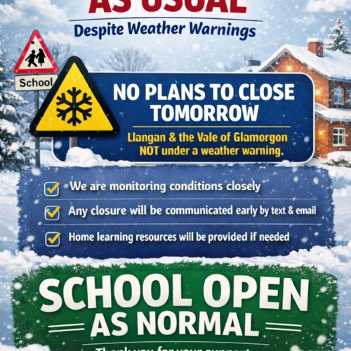 Despite weather warnings for snow overnight and tomorrow linked to Storm Goretti, we have no plans to close school tomorrow. Llangan and the Vale of Glamorgan are not currently within...