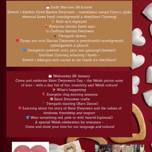 The Criw Cymraeg are looking forward to celebrating Saint Dwynwen’s Day, the Welsh patron saint of love, with a day filled with fun, creativity and Welsh culture.